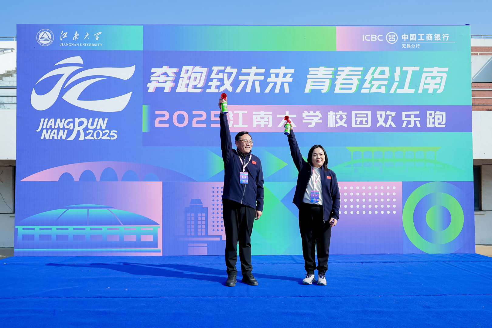 江南大学党委书记吴正国,党委副书记倪松涛,党委常委、党委组织部部长张梁,校长助理、山东第一医科大学副校长马鲁豫,体育部主任秦永和以及中国工商银行无锡分行行长徐碧云,副行长张晔蕴、杜敏,高级经理徐洪春等领导出席了起跑仪式。倪松涛致开幕辞。他在致辞中指出体育是强国之基,健康是奋斗之本,希望全体参赛师生和校友在欢乐奔跑中尽情展现,跑出突破自我的“江南速度”、跑出携手同行的“江南风采”,更跑出担当奋进的“江南自豪”。吴正国宣布开赛。比赛在热情洋溢的赛前热身操中拉开帷幕,吴正国、徐碧云为比赛鸣枪,倪松涛、张梁、王维、单筱婷、黄锋林、周伟涛、周云龙等领导作为领跑者,带领参赛的师生校友从体育中心跑道奔涌而出,踏上了充满挑战与活力的赛道。